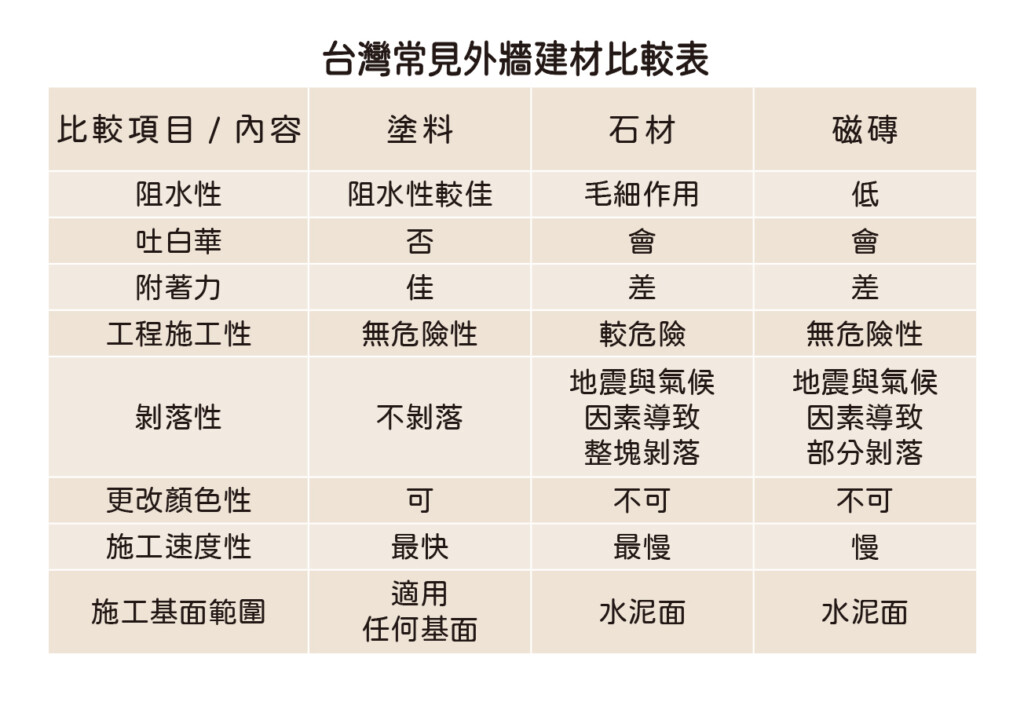 建築物外觀建材的使用必須考量到地域環境及氣候因素,如台灣屬地震頻繁又潮濕的氣候型態,建築物的外牆建材品質格外重要。台灣老舊建築外牆時常發生磁磚掉落砸傷人的意外事件,或是外牆出現膨脹、剝落、汙漬、裂痕等狀況,可能並非單純接著劑或磁磚品質不良所造成,更有可能是結構體出了問題而衍生出牆壁裂縫、滲漏水或壁癌,輕則影響建築物美觀,嚴重則可能因裂縫使水氣滲入牆內,長期累積影響建築物的使用性及結構安全,不可輕忽。