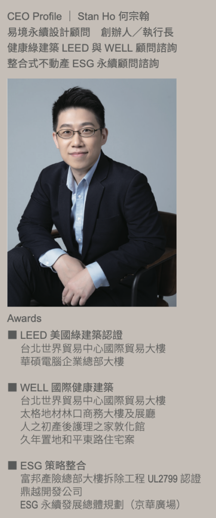 易境永續創業迄今將屆滿十年,一路走來見證台灣綠建築、健康建築的發展歷程,現如今台灣不動產的永續路徑越被重視,其代表性的作品,包括台北世貿中心國貿大樓、富邦產險總部大樓拆除工程、京華廣場頂級商辦園區等。