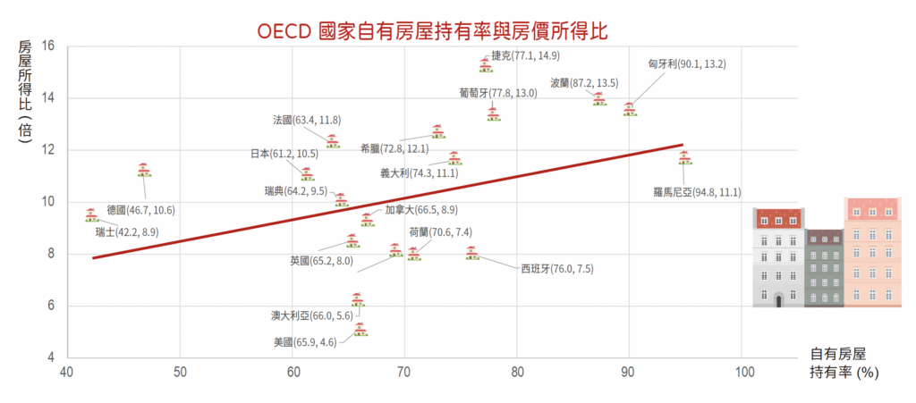 資料來源:房屋所得比為numbeo.com,更新日期2022年7月,自有房屋持有率為TradingEconimics.com,更新日期多為2022年12月。