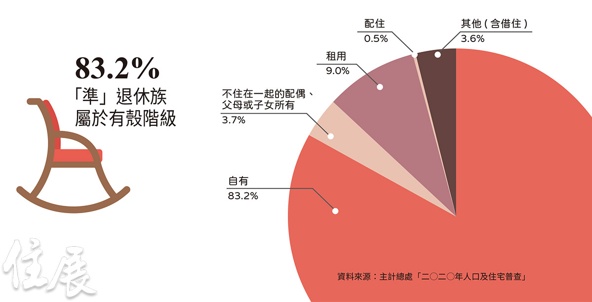 事實上,這群在1950、1960年代出生的「準」退休族多數不是無殼蝸牛,根據主計總處「2020年人口及住宅普查」結果,全台約196.8萬戶房屋,戶長年齡介於55歲至64歲之間,其中83.2%房屋(約163.8萬戶)為戶長自有,只是,名下有房產,不代表退休後就能安心居於原處。