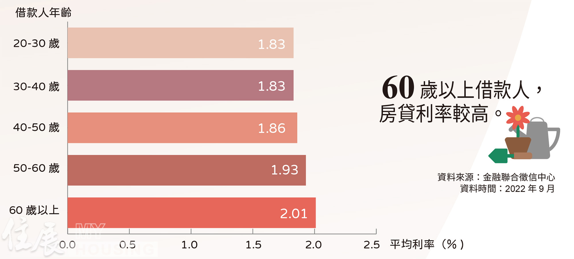 根據聯徵中心統計,2022年9月,全台60歲以上人口中,約24萬人是房貸族,平均房貸利率2.01%,同時間,20歲至40歲年齡區間的房貸利率,僅1.83%。60歲以上房貸族的利率較高,原因之一,為部分案件借款人像房東奶奶一樣,屬於購入第二屋以上的置產族。
