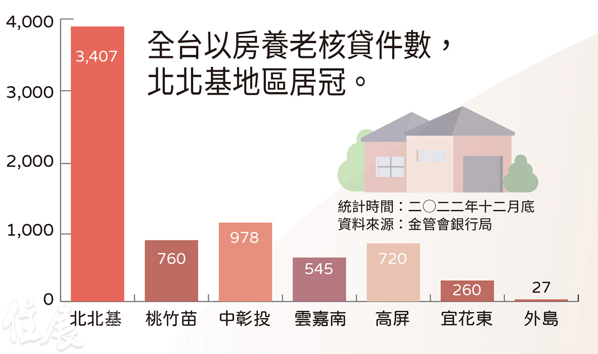 根據金管會銀行局統計,截至2022年12月底,國銀「以房養老」累計核貸件數近6700件,核貸金額約378億元,其中又以北北基地區核貸件數最多、金額最高,因為在雙北市精華區段的老屋,銀行鑑價較高,儘管貸款額度普遍最高僅約房屋鑑價金額七成,仍相對容易說服年邁屋主加入以房養老行列。