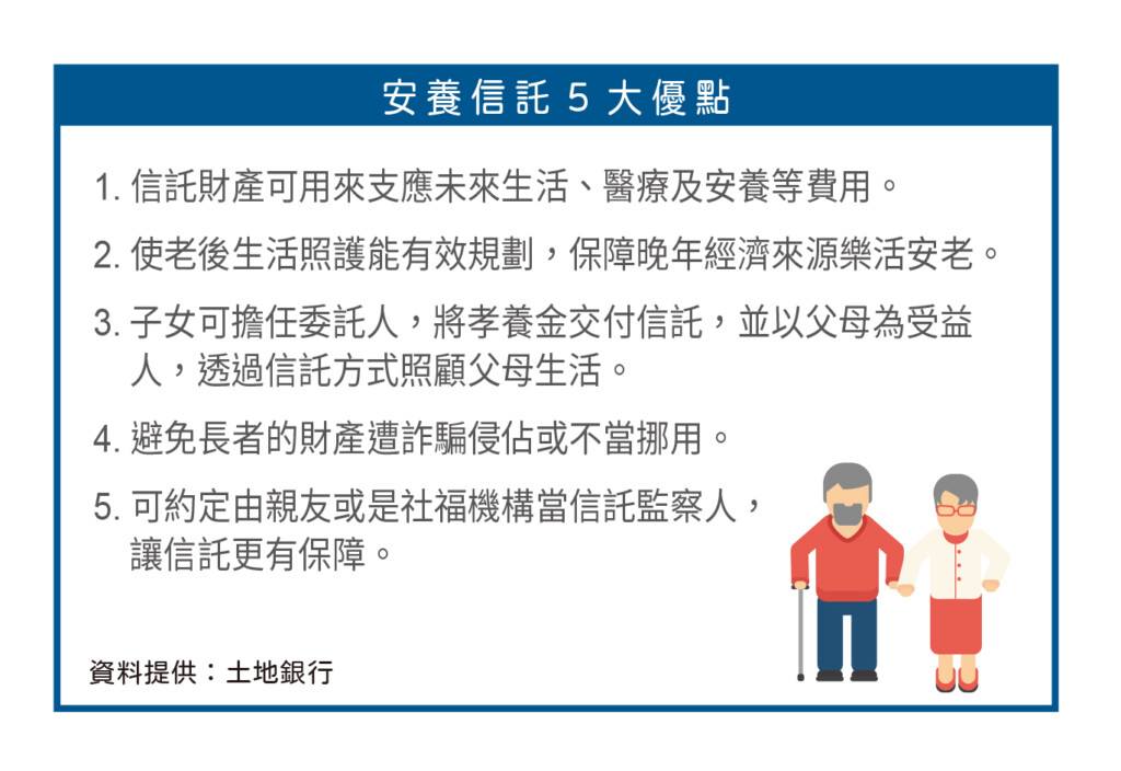 土地銀行表示,這些問題可藉由信託「專款專用」機制,使長者財產獲得保全,老後生活照護能有效規劃;並運用信託財產支應未來生活、醫療及養護等費用,維持長者的生活品質,以保障晚年能樂活安老。