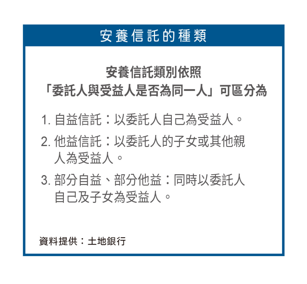 依照委託人與受益人是否為同一人,可區分為:自益信託、他益信託、部分自益及部分他益(如圖說明)。現階段開辦安養信託,通常約定受益人年齡達五五歲或是身心障礙者。甚至還有取消受理金額門檻、年齡限制等創新的「預開型安養信託」。