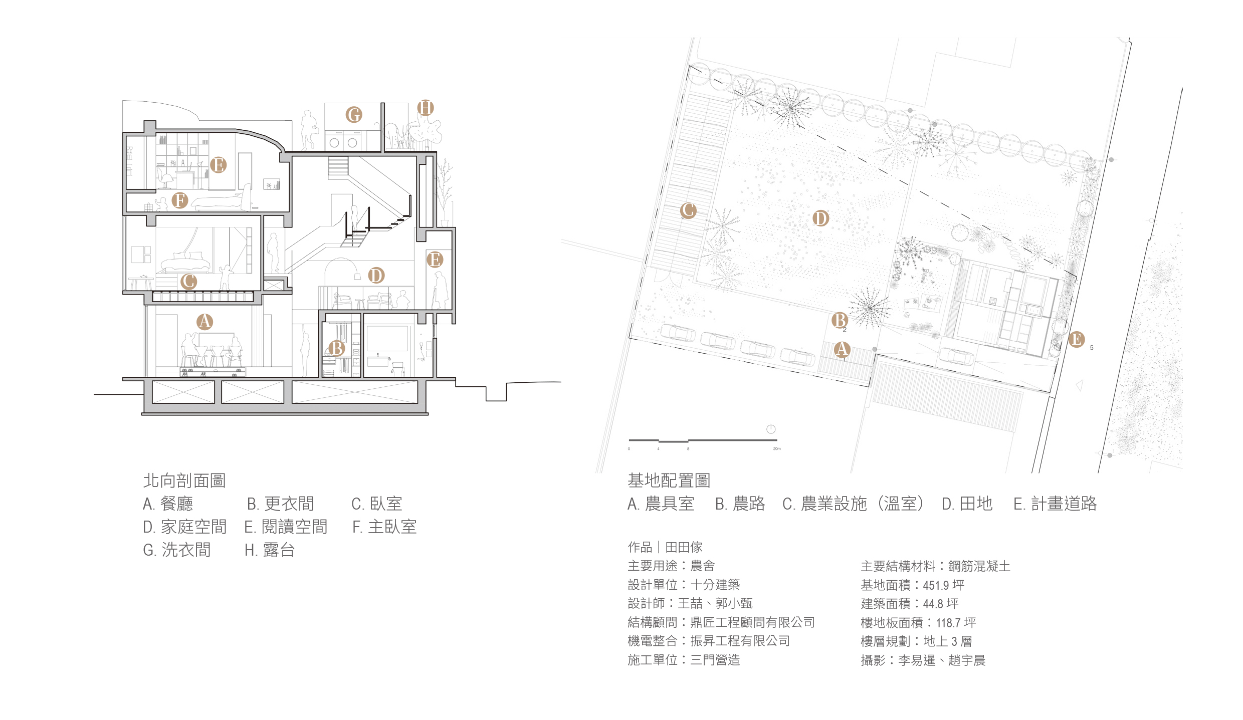 由於倆老日常仍有農務活,因此十分建築的王喆與郭小甄,選擇在他們務農的田中央,以田字型平面構成,將四個高程不一的小房子合而為一,打造一棟三個樓層卻有13個錯落樓板的有趣建築,來區隔空間。