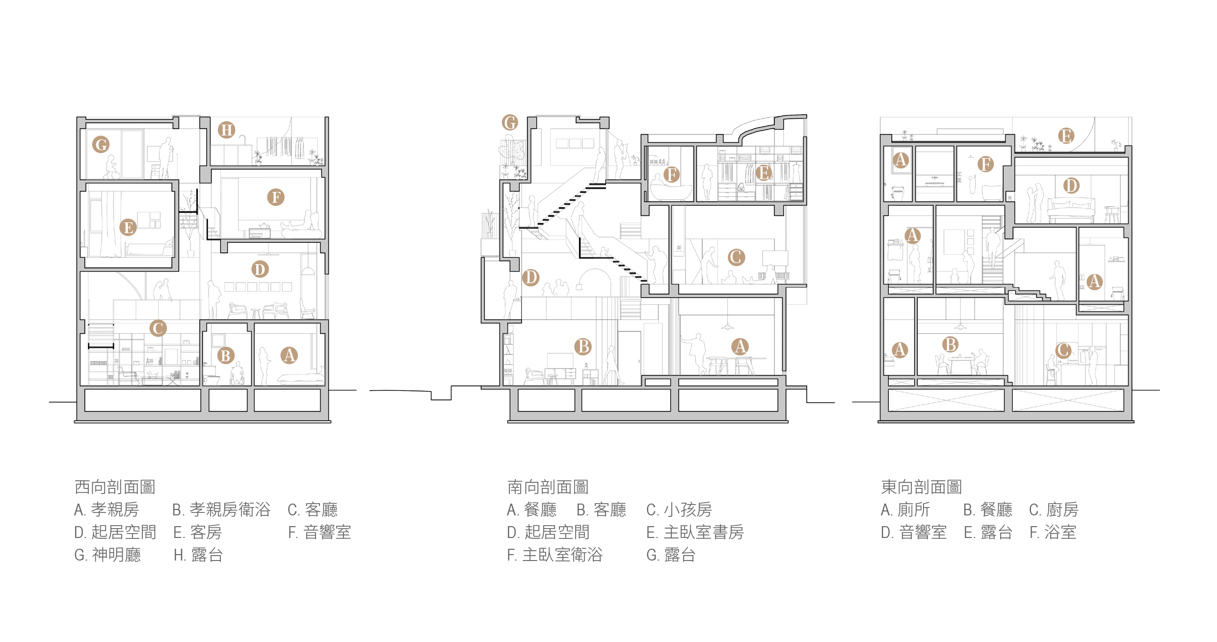 樓板之間的縫隙更引發了空間的流動性,甚至可當作家中傳聲筒,到了飯點吆喝大夥「吃飯了」;在有限的平面中創造具剖面深度的視覺延伸感,建立出三代親人之間,那種緊密又獨立的空間關係。