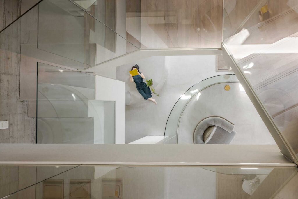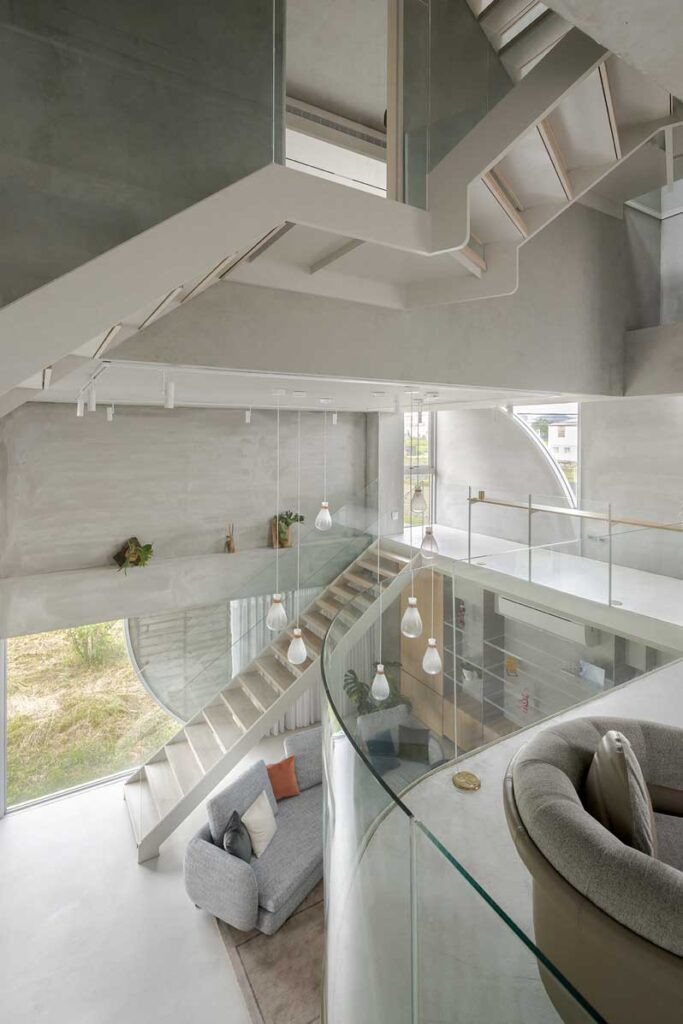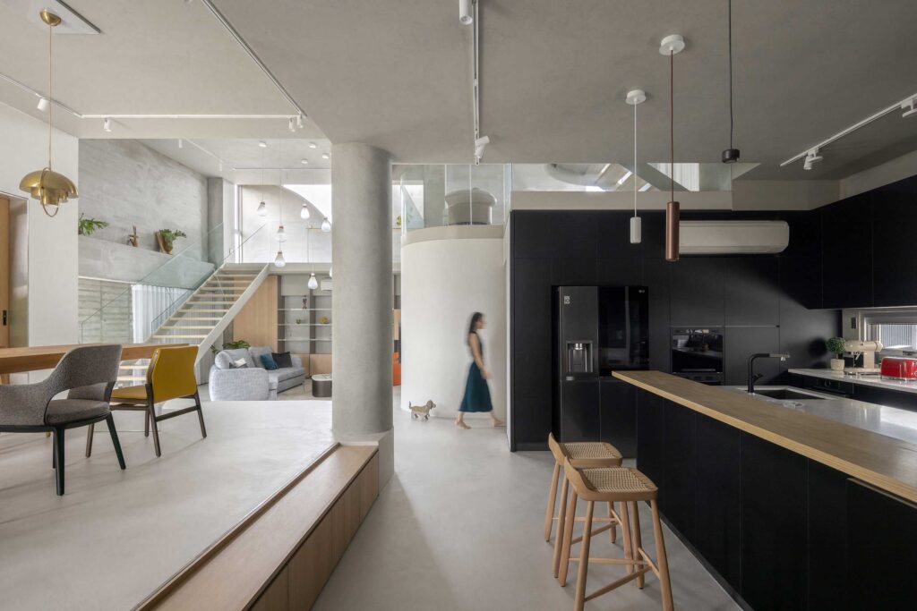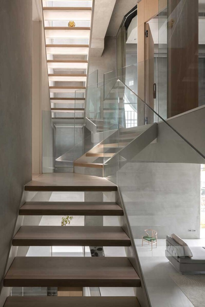 不同時刻的天光,透過挑空中的樓梯,灑落在每一個高程,用光串連起住家中的生活空間,也同時引導出行進時的多方向視線風景,以流動性的居住空間形態,形塑出一種簡單而豐富的日常生活。