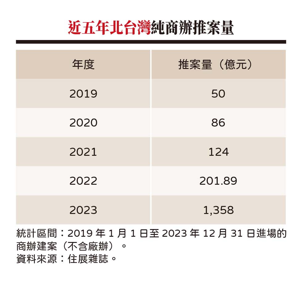 除國外企業擴大投資台灣,本土企業也因應疫後工作型態改變,開始尋求新辦公空間,指標建商看準未來商辦需求,相繼推出商辦作品。經《住展雜誌》調查,2019年來,北台灣商辦推案量逐年成長,2023年在松山指標案挹注下,推案量首次突破千億元,且建案都以預售型態進場。