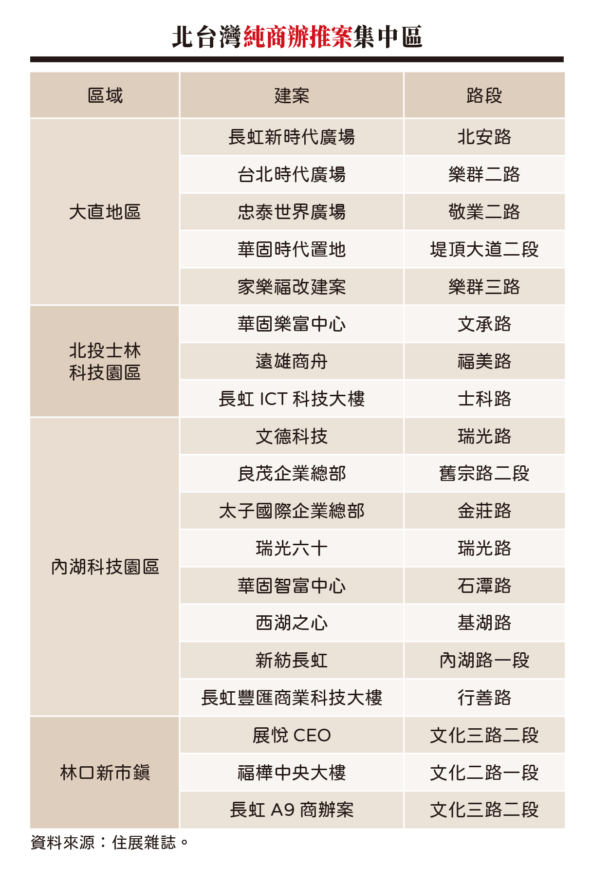 把握台商回國設廠,及本土企業舊辦換新辦等需求,預售商辦相繼進場,使去年北台灣商辦推案量首破千億,從台北大直到新北林口等,都屬近年商辦推案集中區。