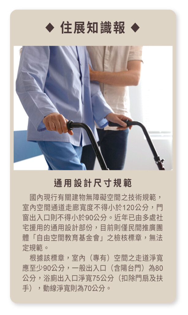 首先在室內裝修方面,最基本的當然是室內起居空間牆面增設若干數量的扶手或類似設備。另一重點是走道寬度;儘管最理想者是按照無障礙或通用設計原則為之,但業內人士分析,其實不需要過寬,大概至少保留到60至70公分即可。
