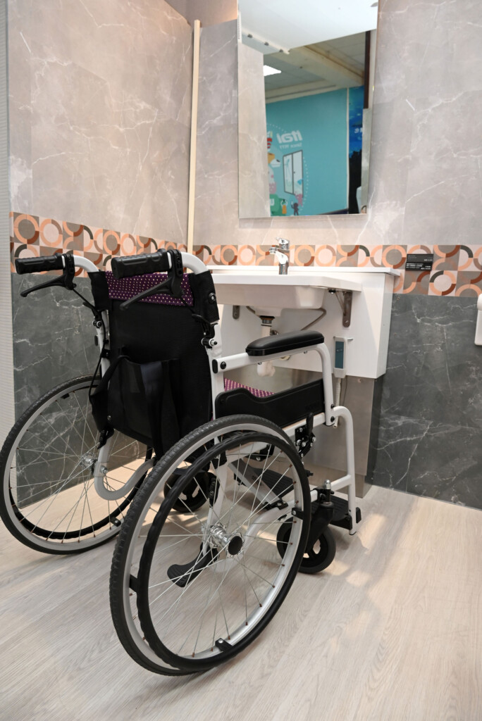 再者,一般高齡者通常無法久站;針對此點,可選用淋浴座椅,高齡者也能享受淋浴樂,市面上有業者兼顧收納及節省空間,設計出可調節高度的淋浴椅、洗臉盆,甚至輔以電動功能,讓輪椅族也能順暢使用。