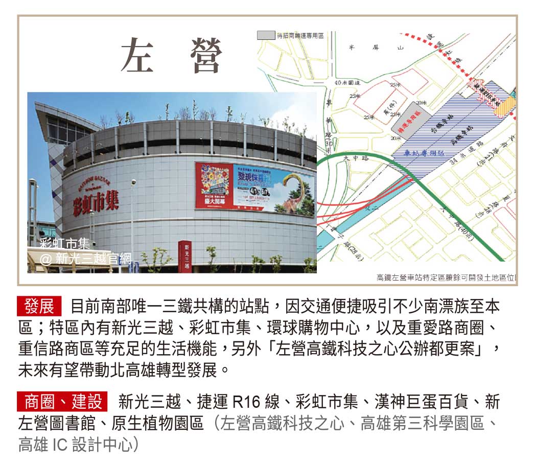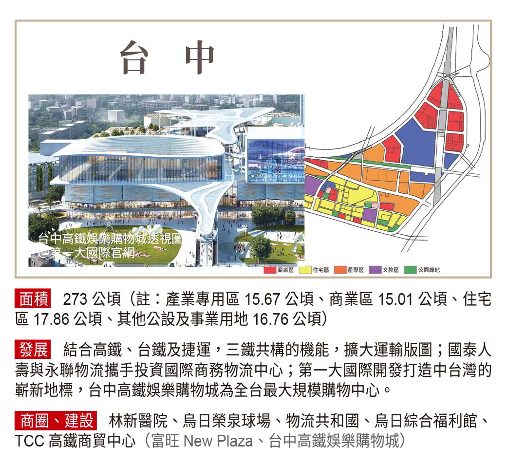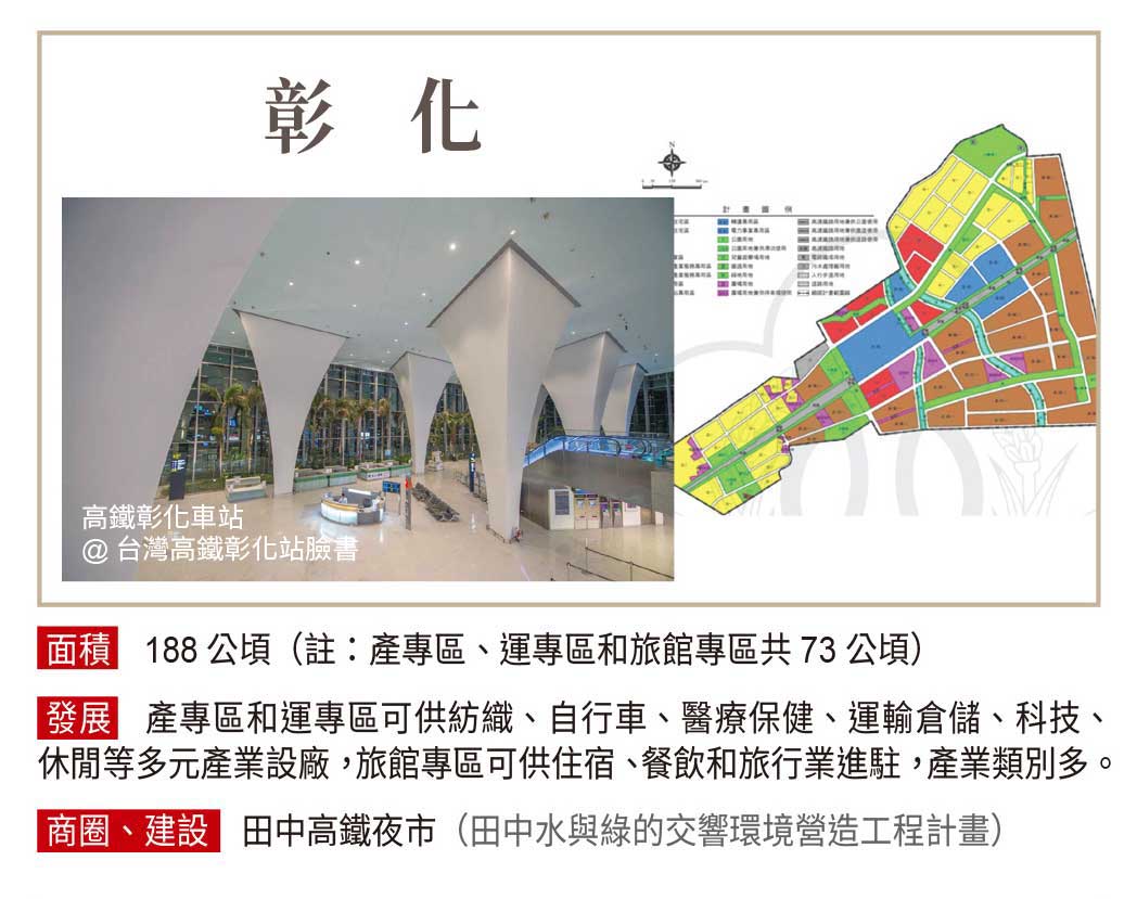 台灣高速鐵路股份有限公司,簡稱台灣高鐵、台高、THSRC,全線縱貫台灣西部走廊,全長350公里,共設有12車站,其中特定區場站開發共九站,廣達2000公頃以上可開發腹地,開發條件優越,其產業專用區及商業區土地,不僅區位佳、面積廣,還可積極爭取高科技產業進駐投資。