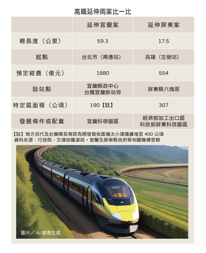 高鐵延伸宜蘭,實際上是北宜鐵路提速計劃或者北宜直鐵(新線)的替代方案;去年完成一階環評,今年稍後將進行二階環評,表訂明年動土,最快2030年完工。延伸屏東段則是前稱之左營案,也已完成初步規劃及一階環評,現正進入二階環評,希望搶在2029年完工。另根據官方說法,未來不排除繼續往南延伸至墾丁。