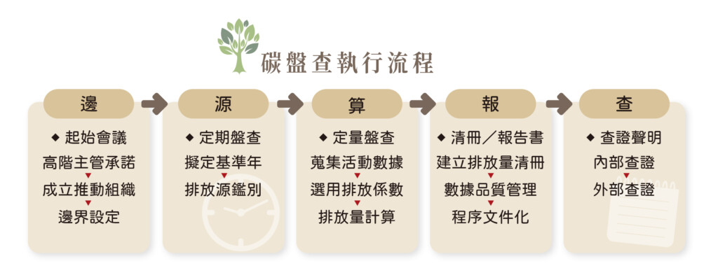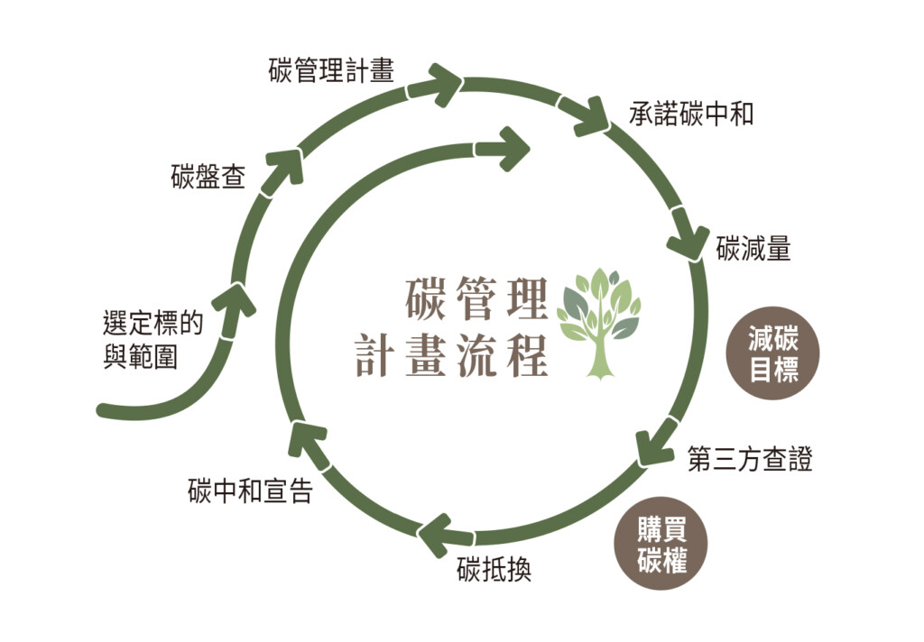 先講「碳管理」,是將人為排放的溫室氣體加以控制甚至減少,進而降低對環境造成負面影響的一連串策略,而「碳盤查」便是其中的許多步驟之一。
