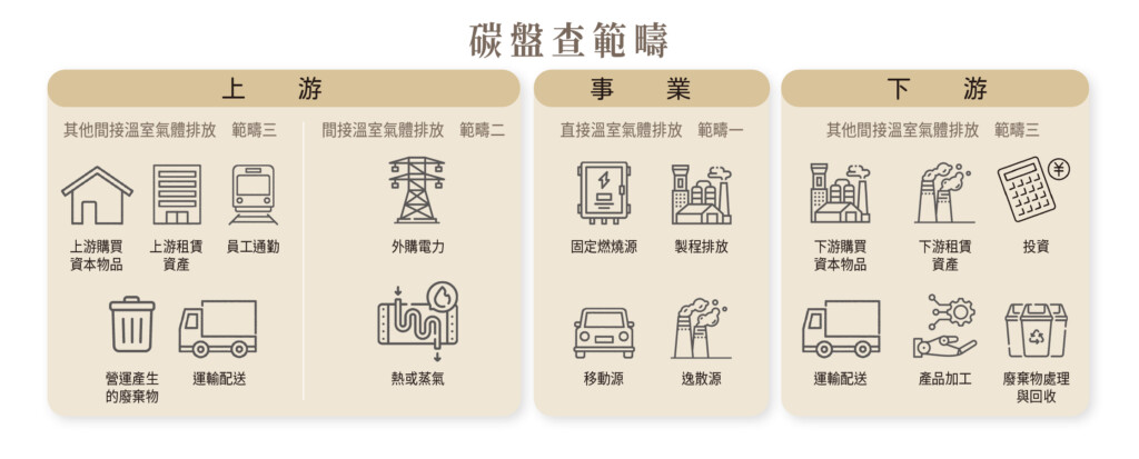 而碳盤查則是以「企業」、「組織」作為調查對象,計算營運中所有活動的直接或間接碳排放量,如採購、生產、銷售、供應、運輸,以及員工上下班、出差通勤等,依據不同定義,一般可劃分為三個範疇,如圖。