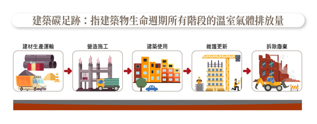 談及營建碳排,不妨從建築碳足跡的流程說起,包括建材生產運輸、營造施工、建築使用、維護更新及拆除廢棄等五個階段,主要來源自建材端,因此多數營建業者選擇從改造工務所下手,包括遠雄建設、冠德建設(根基營造)、大陸建設(欣陸投控)等。