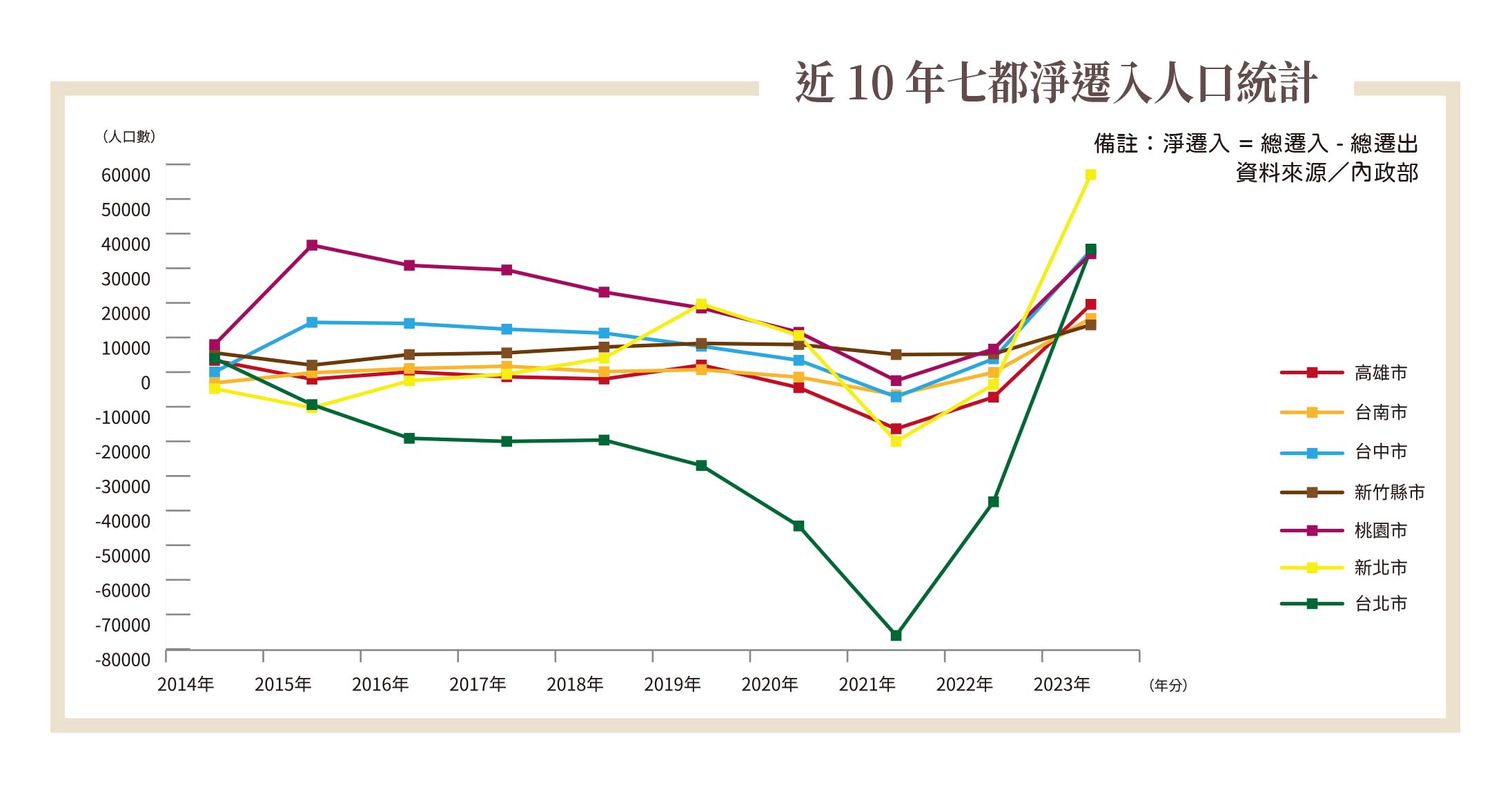 攤開內政部最新資料,2023年台北、新北、台中、台南、高雄等五都的淨遷入人口紛紛創下歷史新高,桃園僅次於2015年,為歷史次高,新竹也寫下近十年新高,顯示在人民逐就業機會而居的鐵則下,一個全台向七都移動的大遷徙時代正悄悄展開。