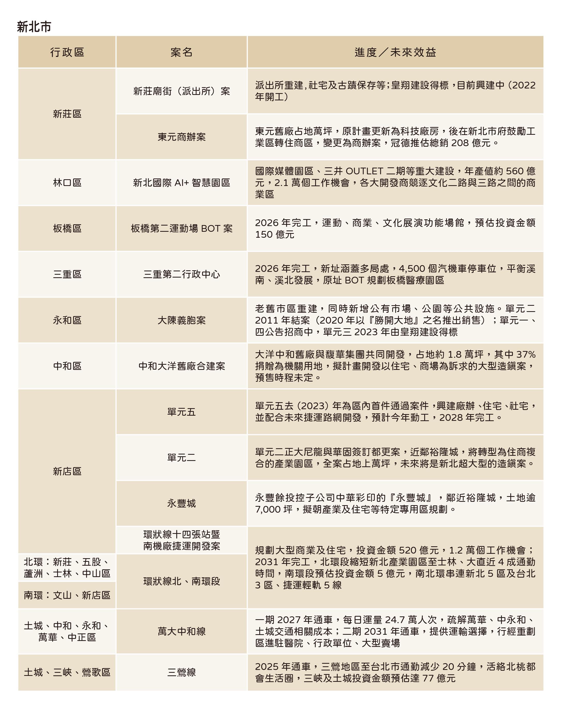 林口AI+智慧園區、新莊武德殿案、永和大陳案、榮工廠案周邊、正大尼龍新店廠都更案、永豐城案、中和大洋舊廠合建案