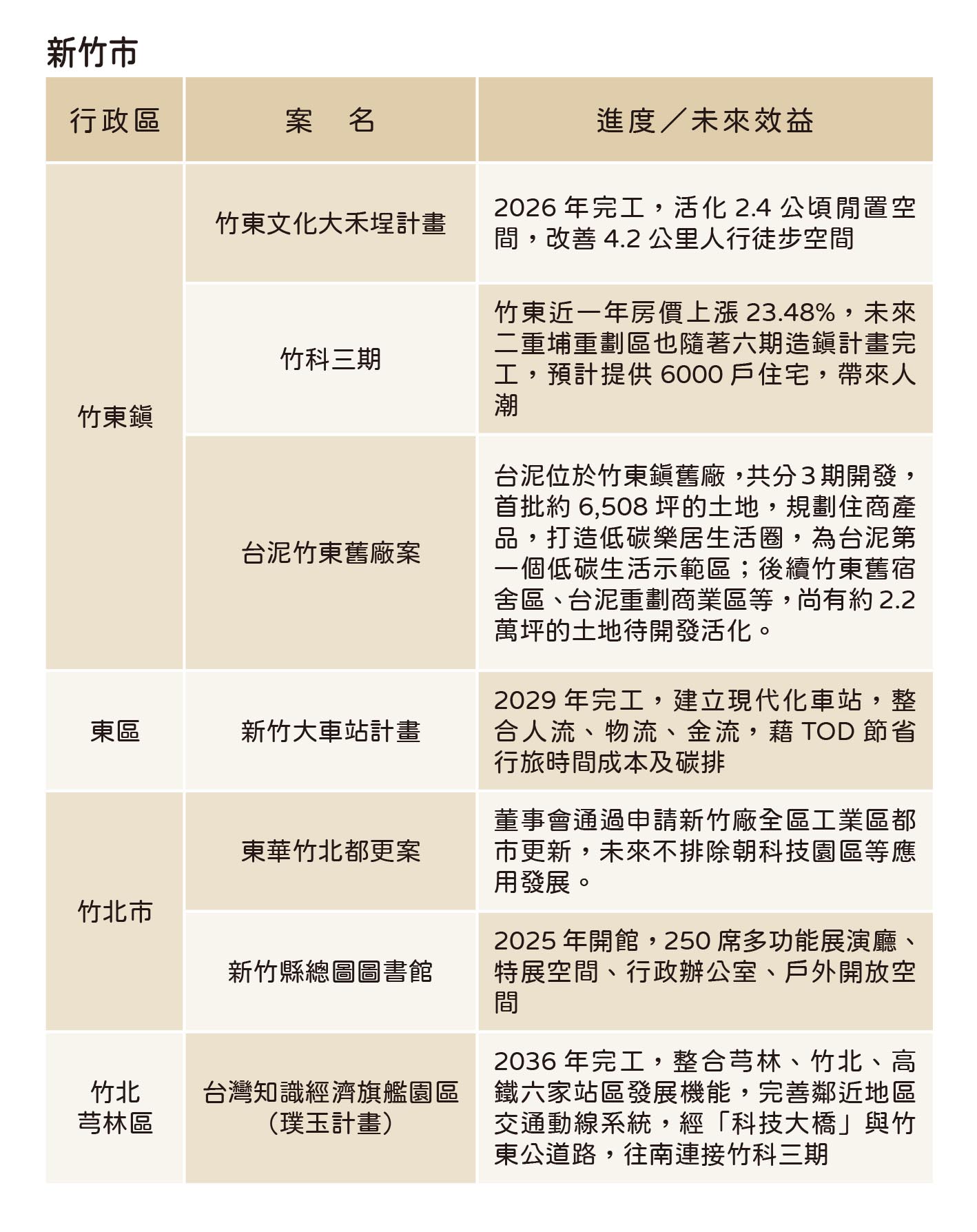 新竹縣市近期主要以台灣知識經濟旗艦園區(璞玉計畫),以及新竹科學工業園區三期相關建設為發展重心,其中,預計於2036年完工的台知園區,現況為多供以農業使用的農地,未來會以知識經濟學習區域作為開發規劃方向,將芎林、竹北的發展機能與鄰近的高鐵新竹站及台鐵6家車站結合,完善區域交通系統,促進整體生活機能。