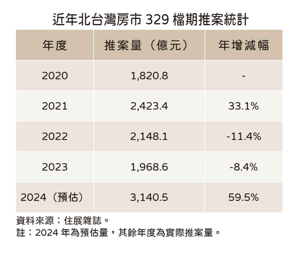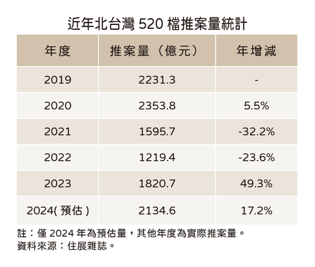 事實上,從年初之際就發現去年建商延後推案的狀態,讓既有量體滿足不了買氣,其後329檔期果然沒讓市場失望,住展雜誌統計的北台灣房市329檔期推案預估量,來到約3140.5億元,較去年實際推案量成長約1171.9億元,年增幅6成,創歷史新高紀錄!態勢也延續到520檔期,預估推案量為約2134.6億元,是2021年以來高點,比去年實際推案量增加約313.9億元,年增17.2%。