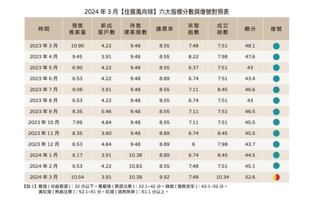 轉眼間2024度過了上半年,房市景氣不只一如預期,一掃去年大選、平均地權條例等不確定因素陰霾,供給與需求兩造更表現非凡激情,長期以預售屋推案量、新成屋戶數、成交組數、來客組數、議價率、待售建案個數總結每個月預售與新成屋市場的住展風向球,3月上演大驚奇,這些指標的綜合分數來到52.6分,對應燈號轉向代表熱絡的黃紅燈,中止2022年12月以來連續15個月屬於房市平穩意義的綠燈,更是2008年4月之後,睽違16年又見黃紅燈。