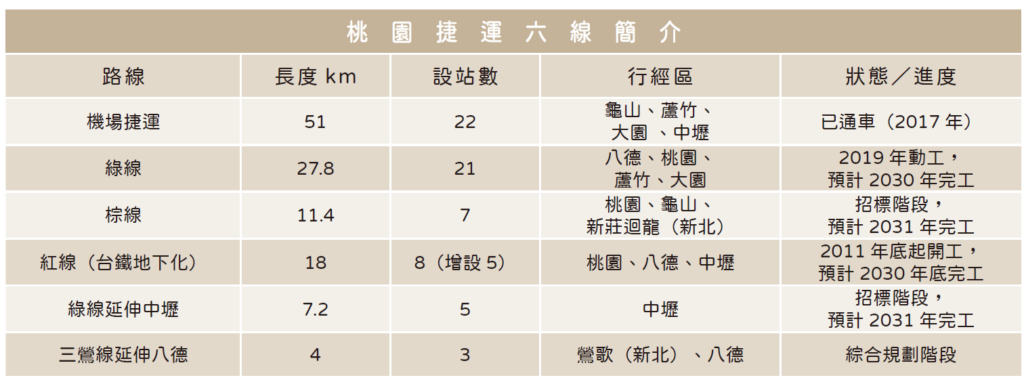根據桃園捷運局官網說明,桃園捷運(第一階段)以所謂「三心六線」為建構方針。三心是指原本北桃園、南中壢兩大都心,加上推動中的航空城(新都心);六線則包含機場捷運、綠線、棕線、紅線(台鐵地下化)、綠線延伸中壢及三鶯線延伸八德。