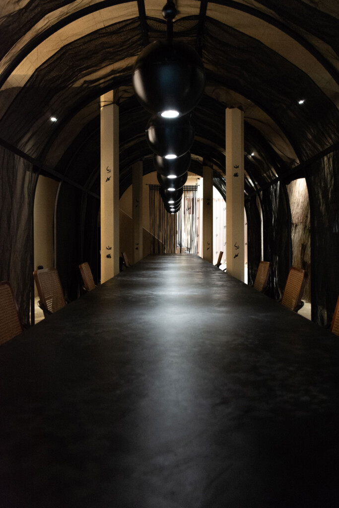 本案空間規劃包括茶席、包廂、吧台、商品陳列區及內場廚房,約50坪左右,共有26個座位,一走進店內映入眼簾的正是一張大長桌,可同時容納20個人,採拱形門做裝飾設計,其上罩著養殖蘭花的黑色遮陽網,恰與台灣舊時「菇寮」概念有異曲同工之趣。