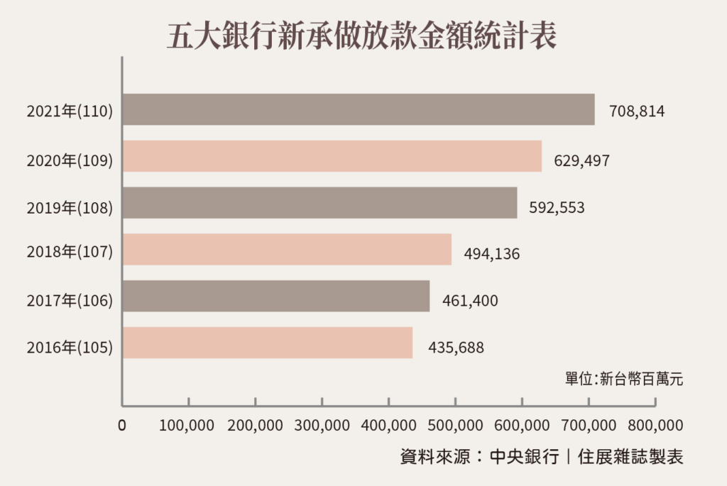 攤開五大銀行新承做放款金額統計,過去五年的購屋放貸金額,每年平均增加300億元,但就在2019年整年大增約1000億元,平均放貸增幅成長超過三倍。