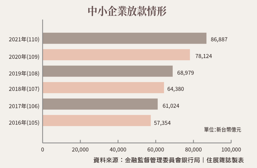 此外,從中小型企業放款統計中更觀察到,過去五年年增約3000至4000億元,而在2019年至2020年間,增幅卻明顯上揚,平均放款年增直衝一兆元。(請參考下方圖表)