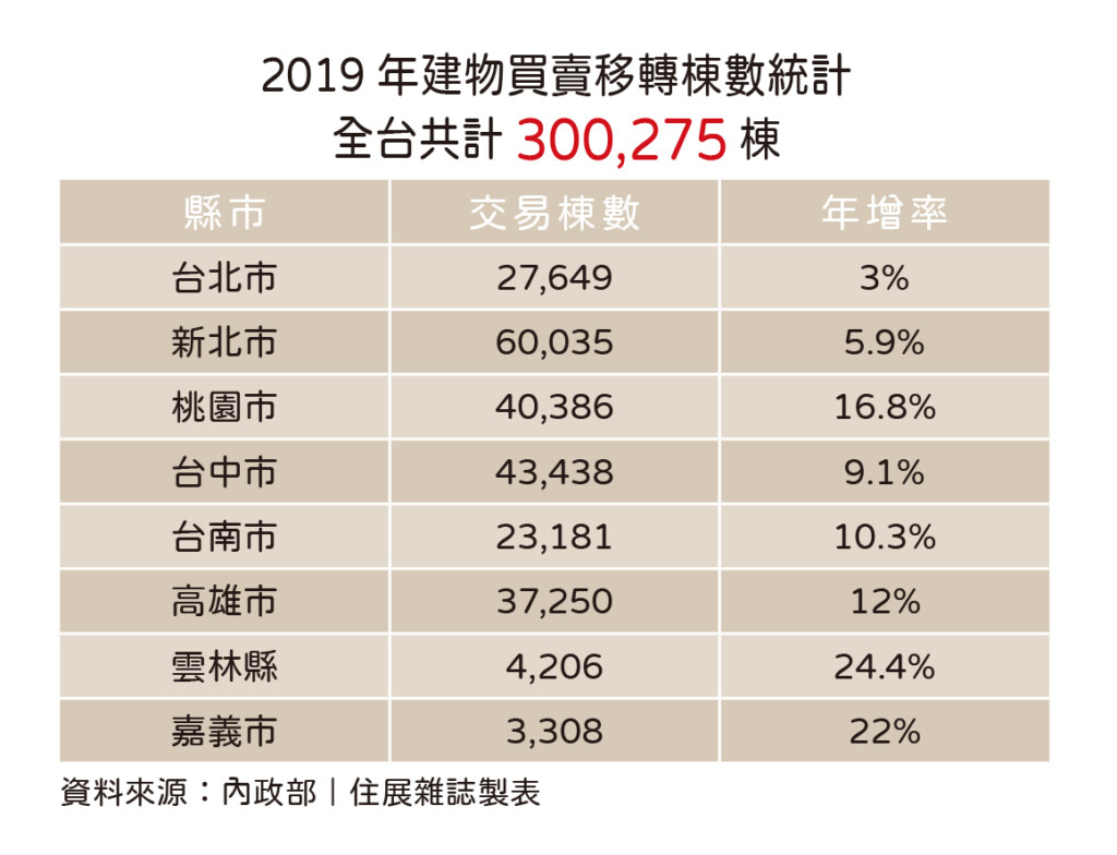 根據內政部統計,2019年建物買賣移轉棟數為30萬棟,是自2014年後再度站回30萬大關;其中,交易最驚人的為雲林縣和嘉義市,分別漲幅來到24.4%和22.2%,而當年12月份,正逢總統大選前,房市也未受影響,仍較2018年上漲逾20%;至於2020年則續創新高,建物買賣移轉棟數以近32.7萬棟,刷新過去七年新紀錄。