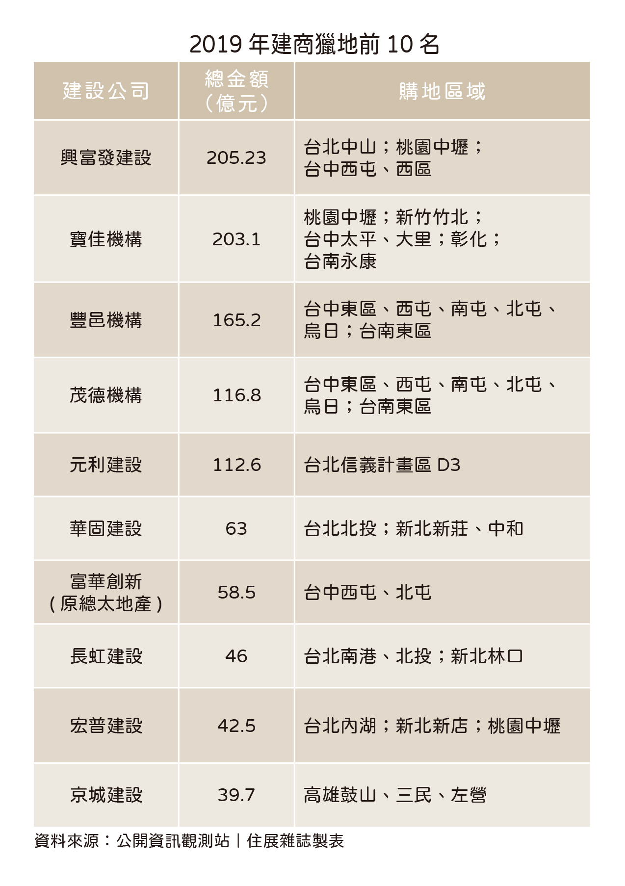 若進一步盤點當年的建商獵地排行,興富發建設一口氣砸逾205億元,將台北、桃園、台中獵進口袋,登上第一名寶座;而寶佳機構則是掏出203億元,鈔票從北撒到南,獵地範圍包含桃園、新竹、台中、彰化和台南;豐邑建設豪灑165億元,收購台中、台南地區;茂德機構則是以近117億元,鎖定新北和土城…。根據高力國際統計,2019年建商累計購地達30萬坪,面積等同於近四座大安森林公園。