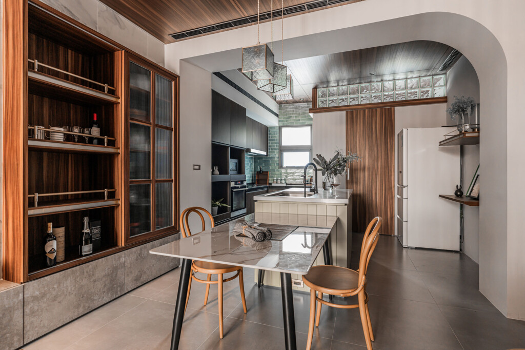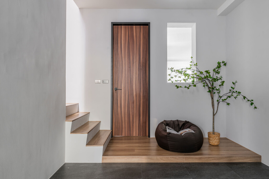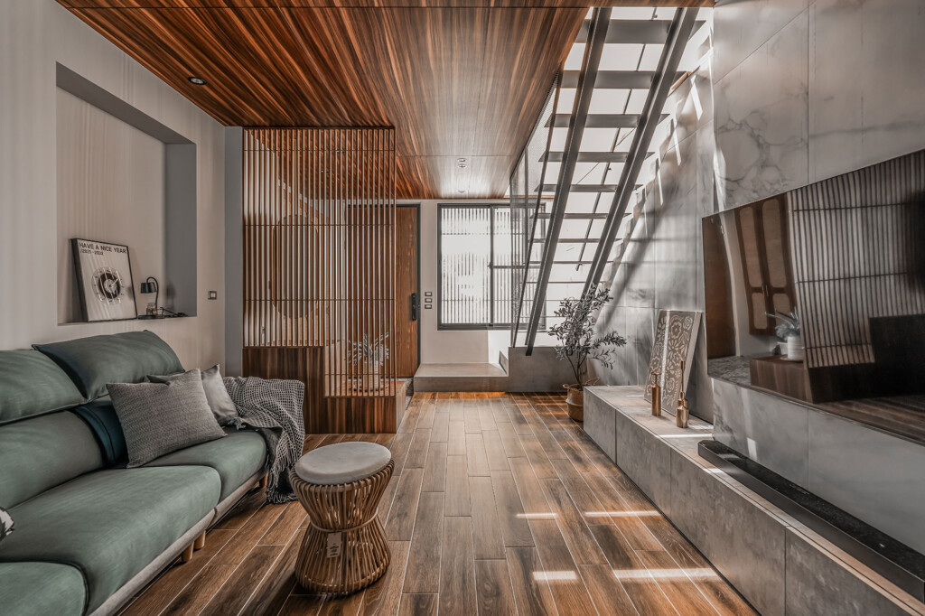 擅長日式風格的謝明翰,和擁有無數點子的陳品宇,攜手合作完成「慕木光廊」此案,實現業主想在家中,就能感受濃濃日式氛圍的夢想。利用暖色木質調,承載40多年歲月記憶,走進其中,沉浸在光影流動,賦予空間生命力。而日式建築中,最具有代表性的「黑色」,則運用在踏進家門前的第一站—建築外觀。
