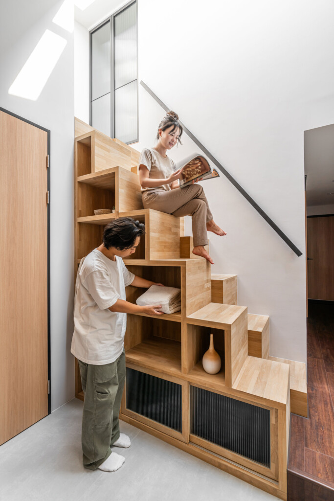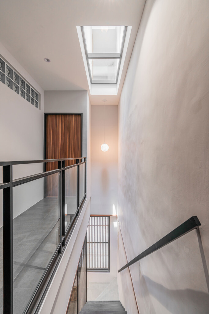 進入3樓,整間房屋最重要的採光來源—天井廊道,視覺從1樓貫通至頂樓,使原本昏暗的廊道區域注入光線;而天井元素也打亮了主臥室的更衣空間,流動光影穿梭於隔柵及木質紋理上,打造溫暖光景。此外,為了保有能走動的樓地板面積,天井採用強化玻璃,打造家中的天空之橋。