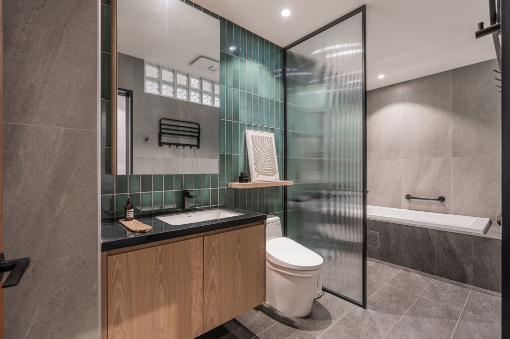 順著木質紋理一路延伸至2樓客房的門和床頭背板,上方搭襯墨綠色藝術漆,午後光線透過鐵花窗灑落室內,和木質紋理相互交疊,享受片刻寧靜、愜意。墨綠色元素延伸至浴室主牆,搭配雲朵狀玻璃磚,引入廊道天井的光線,灑落浴室,獨享森林沐浴空間。