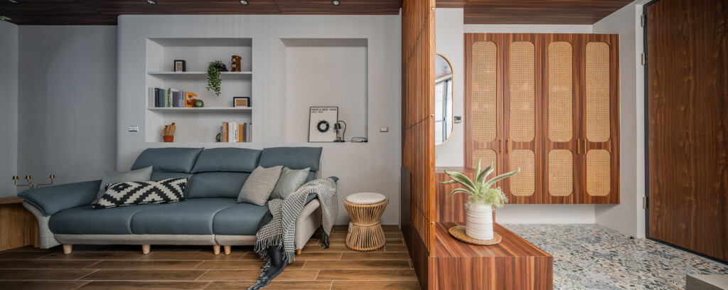 走進玄關,強烈木質調特色,彷彿一秒穿梭到日本,感受日式建築的「虛與實」。玄關櫃上方日式格柵,區劃玄關及客廳空間,減少實體屏障帶來的壓迫,透過虛實交錯元素,反而能延伸空間視覺感。而地面花磚和周遭風格呈現強烈對比,原來這當中,藏著謝明翰喜歡挑戰自我的小巧思,「喜歡試試看不同碰撞,空間花俏就用色調或材質試著融入看看,也可能會有不同的火花。」