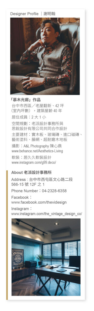 擁有15年室內設計資歷,並獲得國內外無數獎項的思銳設計總監陳品宇,帶著滿滿經驗值,和他的好友搭檔─老派設計事務所總監謝明翰,攜手完成「慕木光廊」,此案翻新40年老屋,替業主打造一個富有日式情懷的居住環境。而他們能並肩打出無數場漂亮「戰役」,其實和人生經歷有很大關聯。