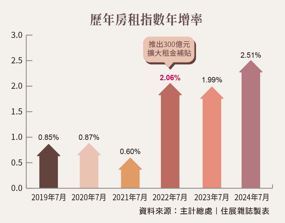 前述租屋改革的矛盾,在蔡政府的另一項政策上也可獲得印證。2022年租金指數正式突破2%,創下25年來最大漲幅,當年政府祭出「300億元擴大租金補貼」政策,喊出要減輕50萬戶租屋族的負擔,不過諷刺的是,自補貼上路以來,租金指數不降反升,年增率更一路狂飆,至今年七月已突破2.5%,呈現連續30個月上漲的態勢,一口氣刷新1981年以來的歷史紀錄。