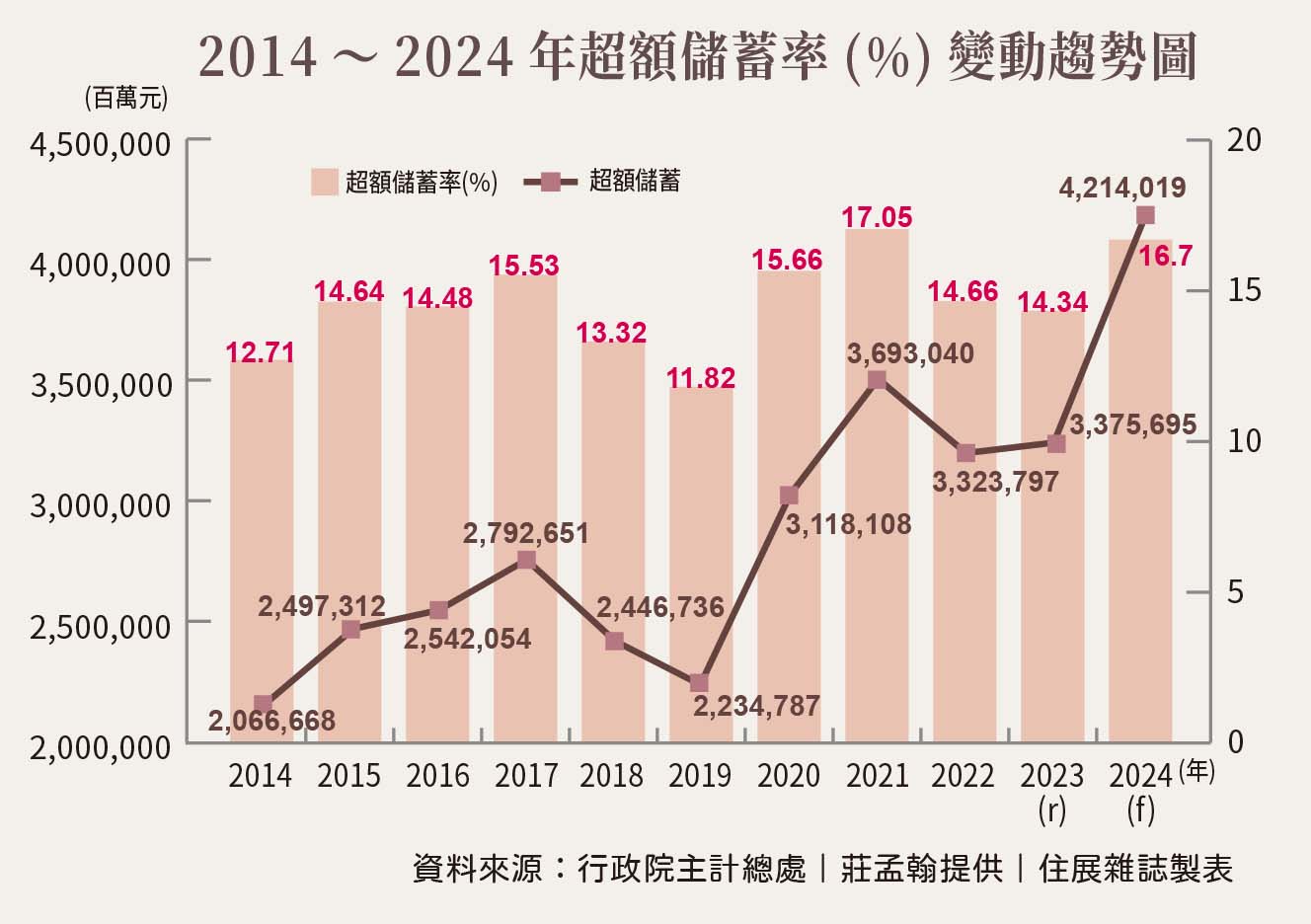 2016年,蔡英文首度執政,當時國內超額儲蓄僅2.54兆元,到了2020年首度達到3兆元,至於賴清德剛接手的2024年,根據行政院主計總處最新預測,超額儲蓄已突破4兆元大關,來到4.21兆元的歷史新高,超額儲蓄率也上修至16.7%,對照2023年德國的6%、日本3.3%、中國1.5%、南韓1.3%,以及美國的−4.2%,這數字絕對驚人。
