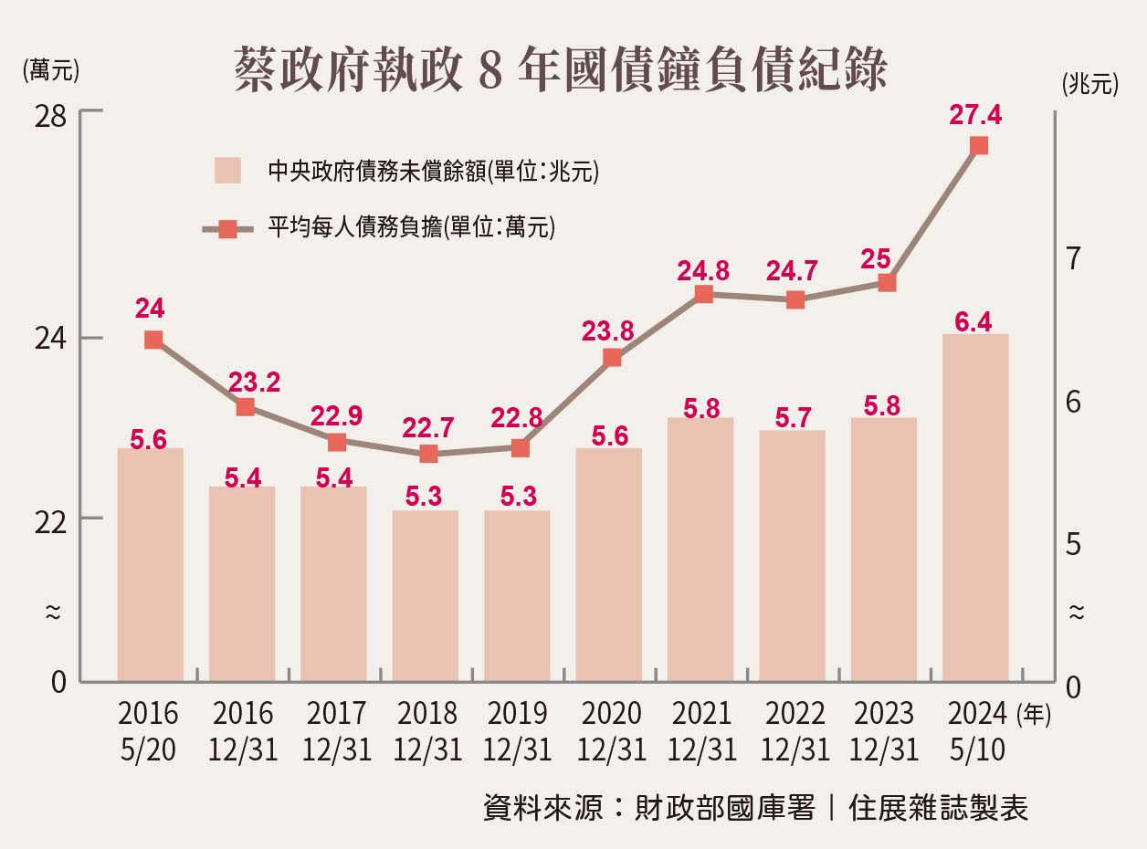 國人收入分配不均,負債卻是全民無差別買單。截至今年五月十日,蔡政府卸任前的中央政府債務未償餘額6兆4128億元,就意味著每位民眾平均負債27.4萬元,史上最高。