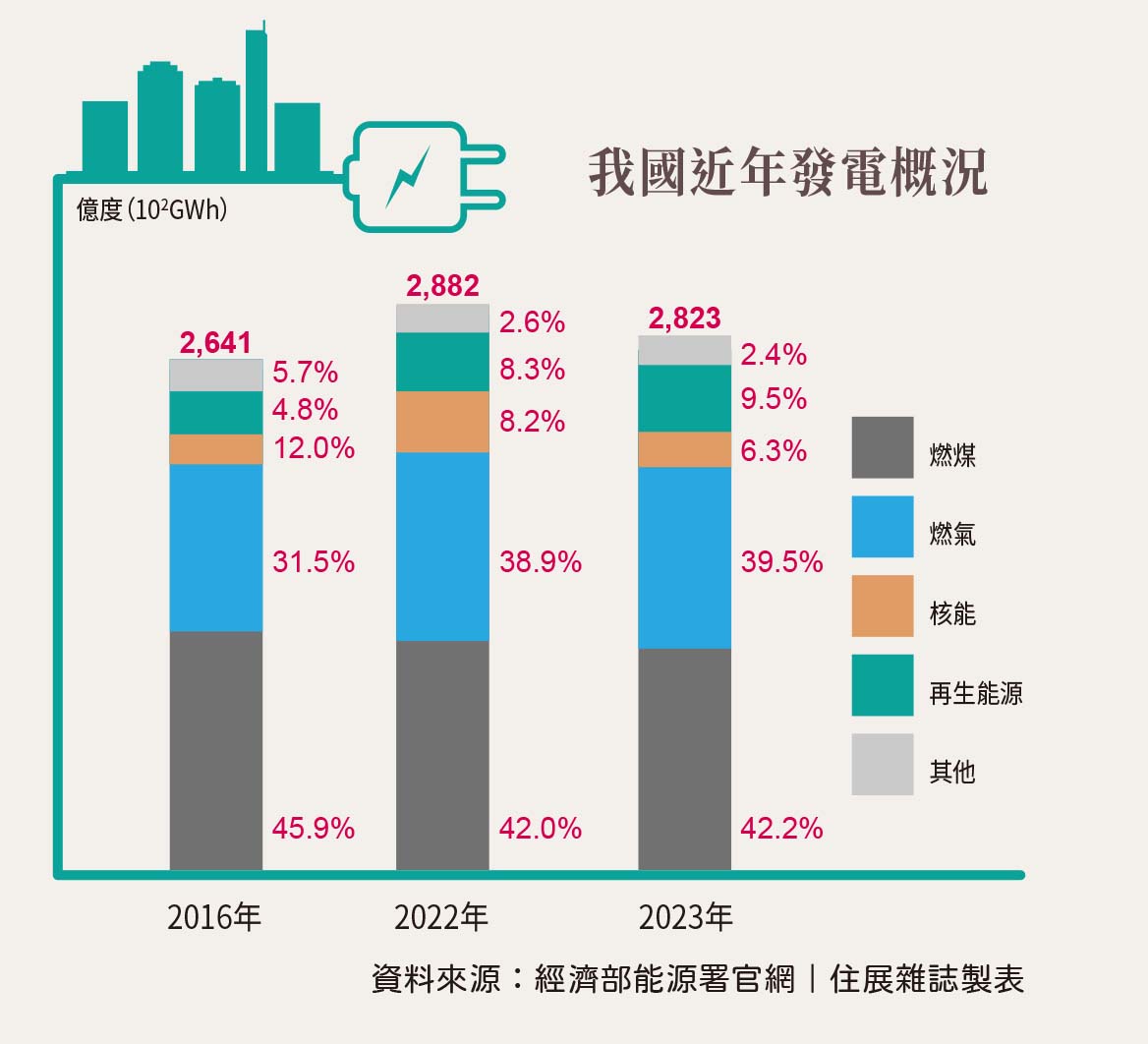 尤其是台灣產業結構與AI、半導體等高耗能產業息息相關,根據經濟部能源署日前公布的全國電力資源供需報告,相關產業用電量在短短五年內恐增加8倍,2028年將達224萬瓩,在考量國內供電狀況後,國內供電壓力高峰推估就落在2025年,然而綠電發展依舊緩慢,若核電再減少3%發電占比,電力供不應求的風險大增。