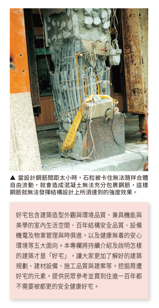 倘若放一堆沒有辦法真正發揮力量強度的鋼筋,不但對建築安全沒有幫助,反而因為鋼筋太密造成混凝土澆置不易而產生蜂窩現象,對於建築安全而言,反而未蒙其利會先受害。因此,絕對不是一昧的提升「耐震係數」就一定安全,惟有每個工地可以同時將每根鋼筋的施作位置及彎鉤都做到精準定位,每根鋼筋的強度才能完整發揮。
