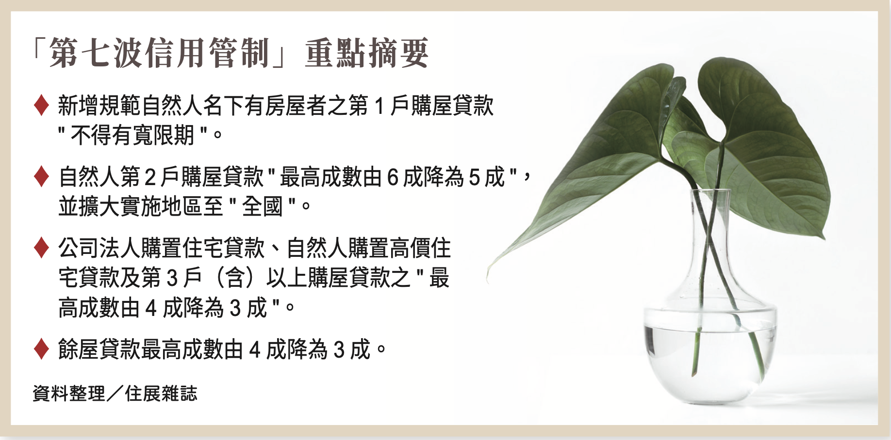 短期內,隨著央行祭出第七波信用管制,市場一旦急凍,上述民眾遭遇銀行滿水位的緊張狀況或將紓緩,不過,一名曾參與央行理監事會,熟悉內部運作人士向本刊表示,央行祭出信用管制措施,主因是防範國內整體金融出現系統性風險,本質其實是要穩定房市,而非打趴房市,因此也不會放任交易量無限下滑。
