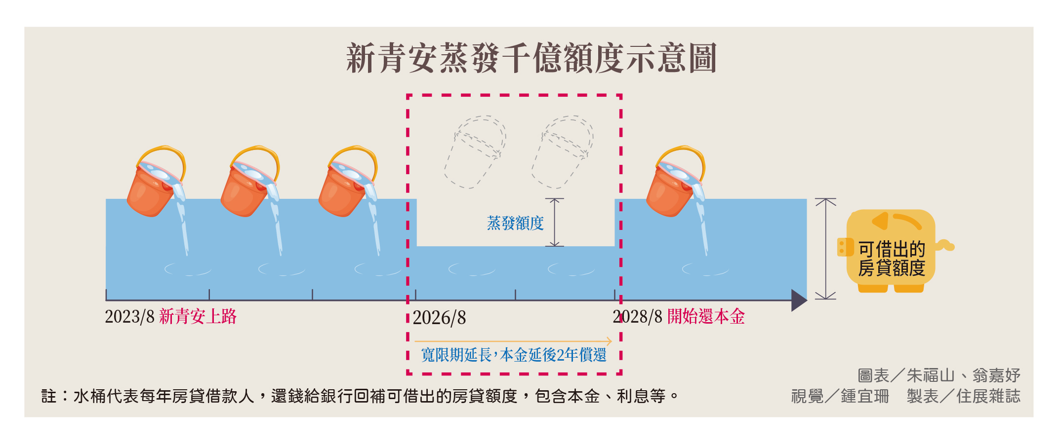 主要原因是,三年後原是2023年8月一般購屋申貸族群開始償還本金的時間點,卻因為新青安將寬限期延長至五年,讓銀行本該用來回補「降低水位」的千億規模本金還款,形同直接蒸發兩年,也變相宣告銀行在2026年8月到2028年8月之間的不動產放貸水位已提前上漲。