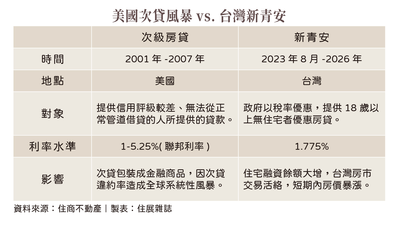 新青安政策造成民眾瘋狂湧入房市的狀況,與央行多次提及的美國次貸風暴有幾分相似,住商不動產企研室總監徐佳馨回憶:「當年因為科技泡沫化、911恐怖攻擊,引發通貨緊縮,於是美國聯邦準備銀行在短短兩年內降息13次,導致房市大好,買房變成全民運動,連條件不好的民眾也想靠買房來翻身,業者就用更高的利率,提供給信用較差或信用紀錄不夠的民眾購屋。」