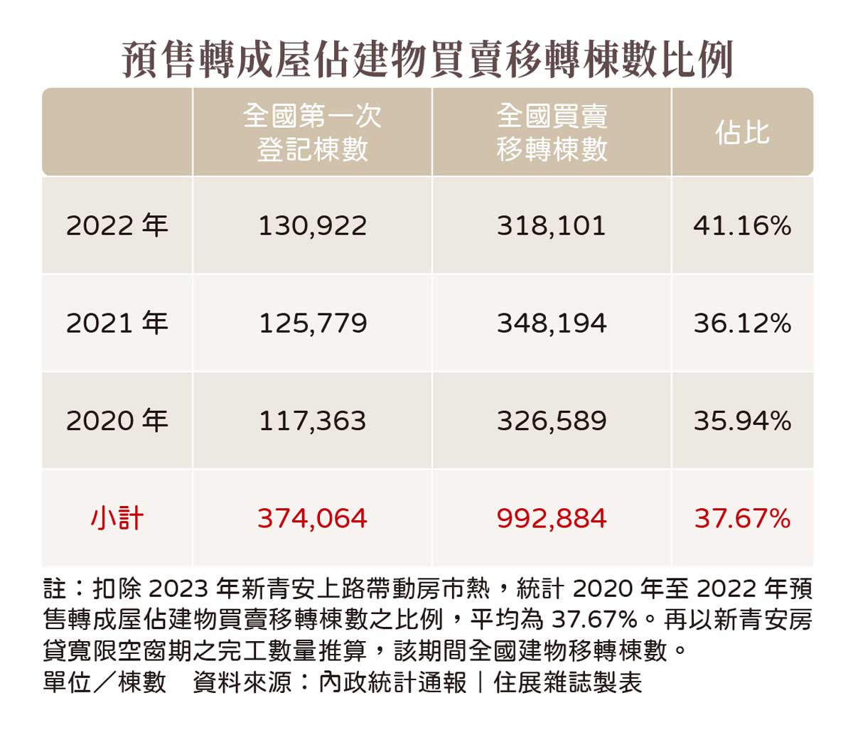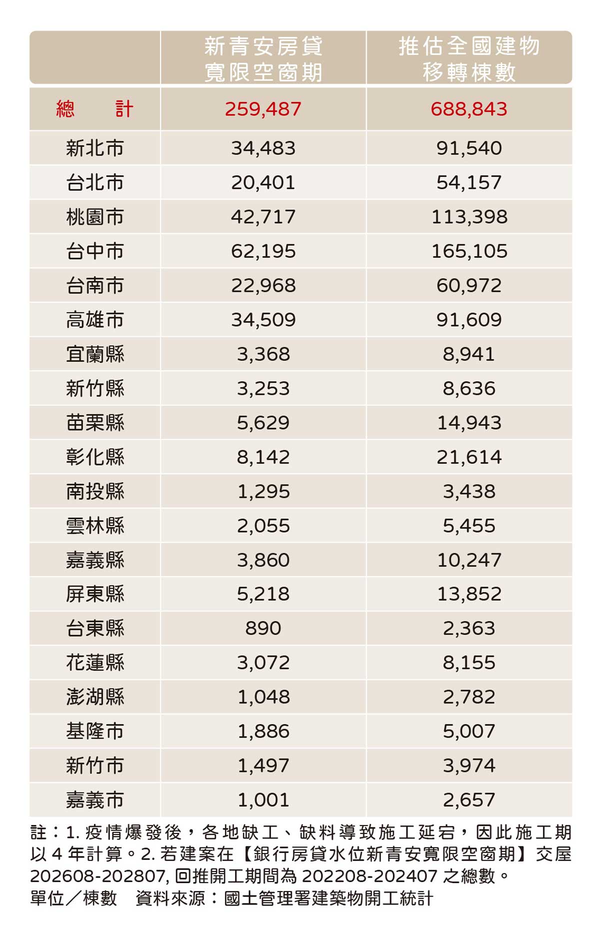 更嚴重的是,銀行水位開始吃緊的2026年,偏偏又撞上2022年全台建案住宅類開工創歷史新高的榮景,若以建案平均施工四年(考量缺工缺料情況)推算,這段時間恐怕還得面對兩年近26萬戶預售屋完工的「交屋潮」,再加上中古等成屋市場的申貸族群,全台很可能出現「70萬戶瘋搶銀行30%水位」的景象。