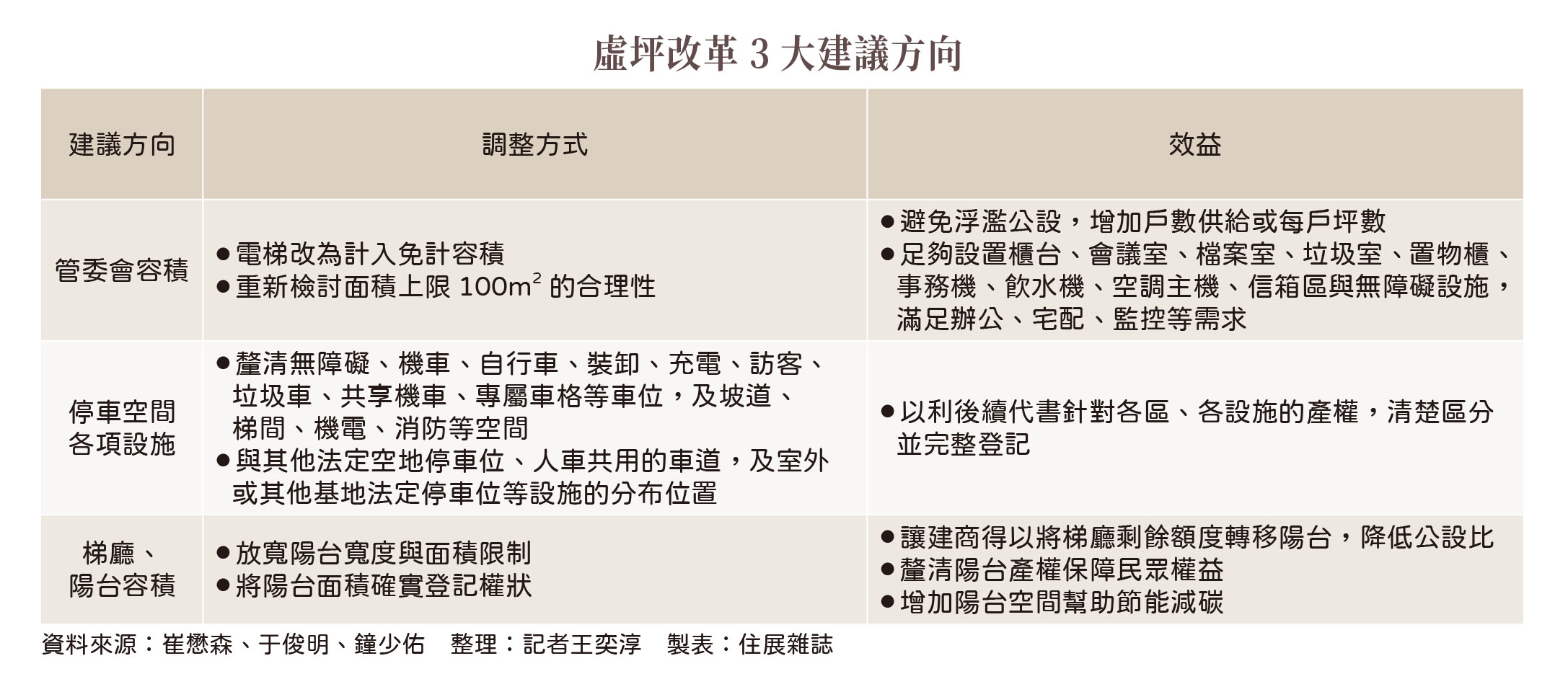 既然民眾購屋預算有限,如何讓每一分錢都花在刀口上就顯得格外重要。《住展雜誌》建議,若要進行該項改革,可優先針對民眾相對有感部分,包含改進管委會容積計算、釐清停車空間各項設施的分布,以及增加梯廳、陽台的免計彈性等三大面向深入探討。