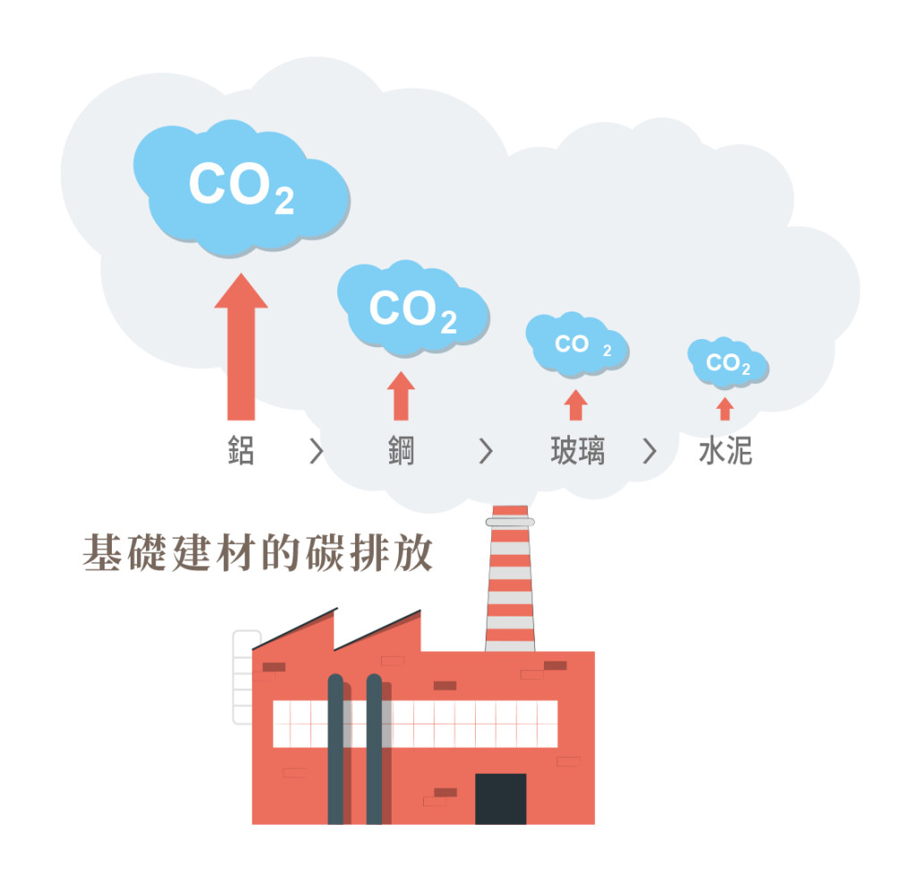 一棟建築物我們少不了鋼鐵、鋁、玻璃與水泥這四種材料,然而這些材料,碳排放都是名列前茅,依碳排放大小順序依次為:鋁、鋼鐵、玻璃、水泥。(如圖)這些材料,在前面提過國際上是屬於會被課徵碳稅的高碳排產業,因此無不竭盡所能逐漸降低產品的碳排放,否則將失去市場競爭力。