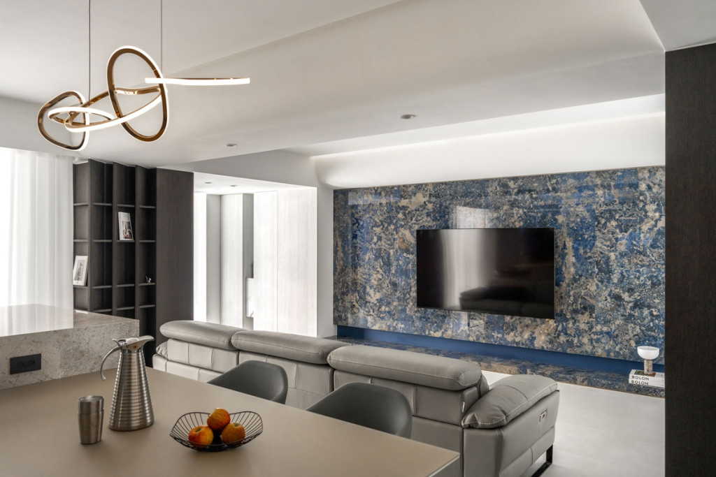 地板選材則選用進口灰階窯燒面磁磚,「這種大面積的鋪設方式,可以進一步擴大空間感」,壁面選擇淺色木皮、局部使用深色木皮點綴,不僅與白色牆面相呼應也增添層次。其中整個空間最奪目的就是電視牆,「電視牆的石材是整個設計中,最早確定的材料」,看來這塊石材已不僅是空間的焦點,也反映了業主對這個家的深厚期待。