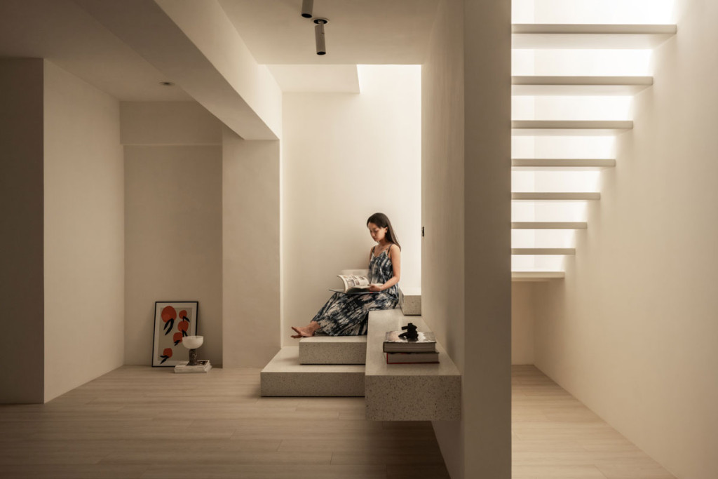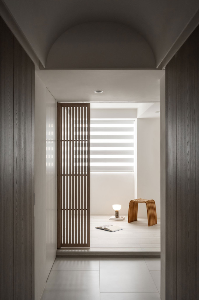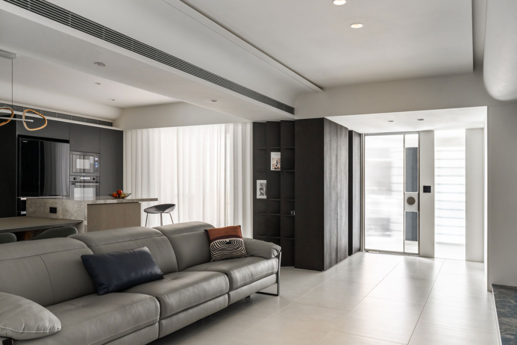 解決採光問題,但在設計過程中,又遇上老舊公寓帶來的另一難題—低矮大樑和空調風管,「我們採用弧形造型並嵌入光源來修飾大梁,並將空間整體色調控制在黑、灰、白三種顏色,保持空間的平衡與寧靜」,吳宜哲利用顏色、形狀和裝潢材質,修飾空間結構上的瑕疵,同時也保留「禪意」和「現代感」的氣息。