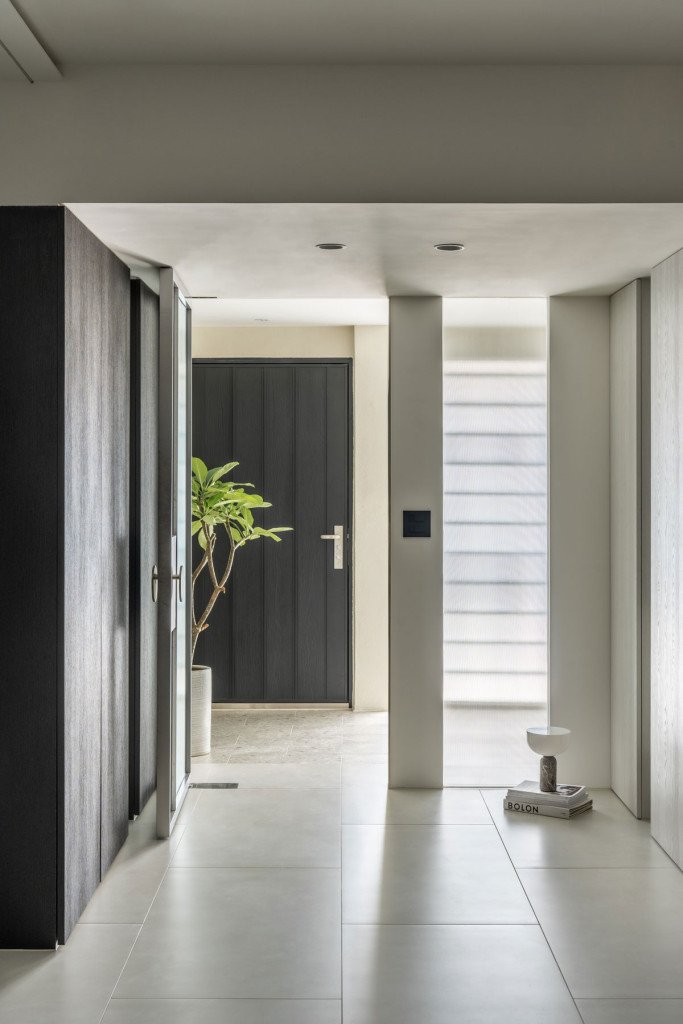 走進玄關就可發現其特別小巧思,因為是一樓戶別,吳宜哲特地將玄關分成內與外的雙重結構,形成外玄關和車庫區域,有效減少來自馬路的噪音干擾。而在大門選材利用玻璃磚和大面積玻璃,並於內門和牆面上開設多處開口,讓自然光順利從外部透進室內;牆面則選用來自日本外牆石頭顆粒塗料,搭配水磨石地磚和鵝卵石,營造出平靜的入門迎賓空間。